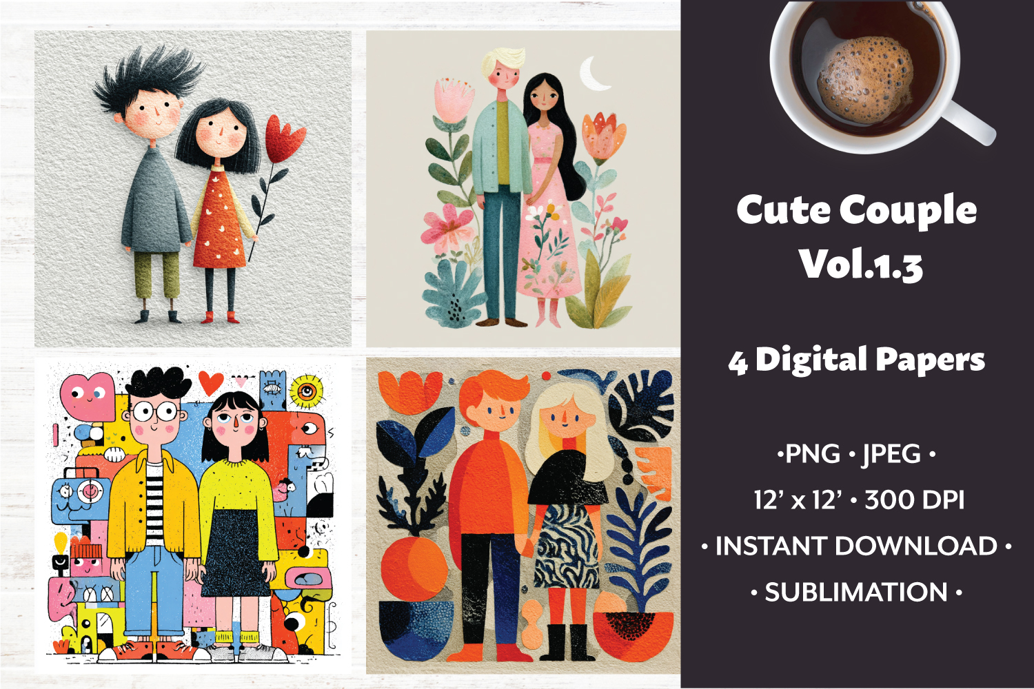 Whimsical Couple Digital Paper Vol. 1.3, 4 PNG & JPEG Images