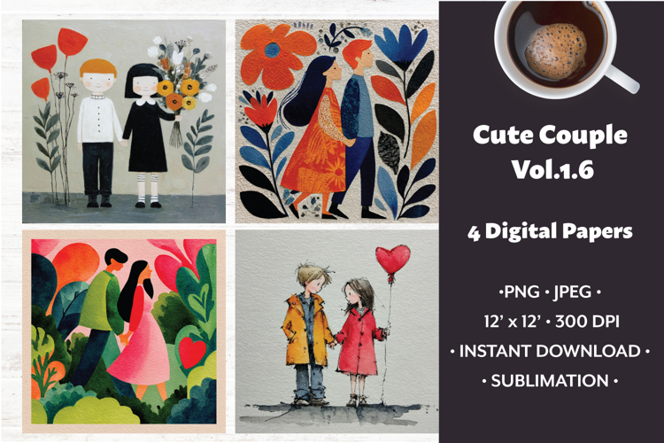 Whimsical Couple Digital Paper Vol. 1.6, 4 PNG & JPEG Images