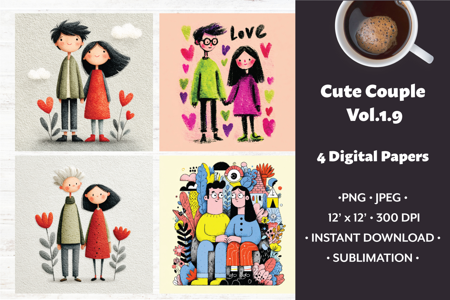 Whimsical Couple Digital Paper Vol. 1.9, 4 PNG & JPEG Images