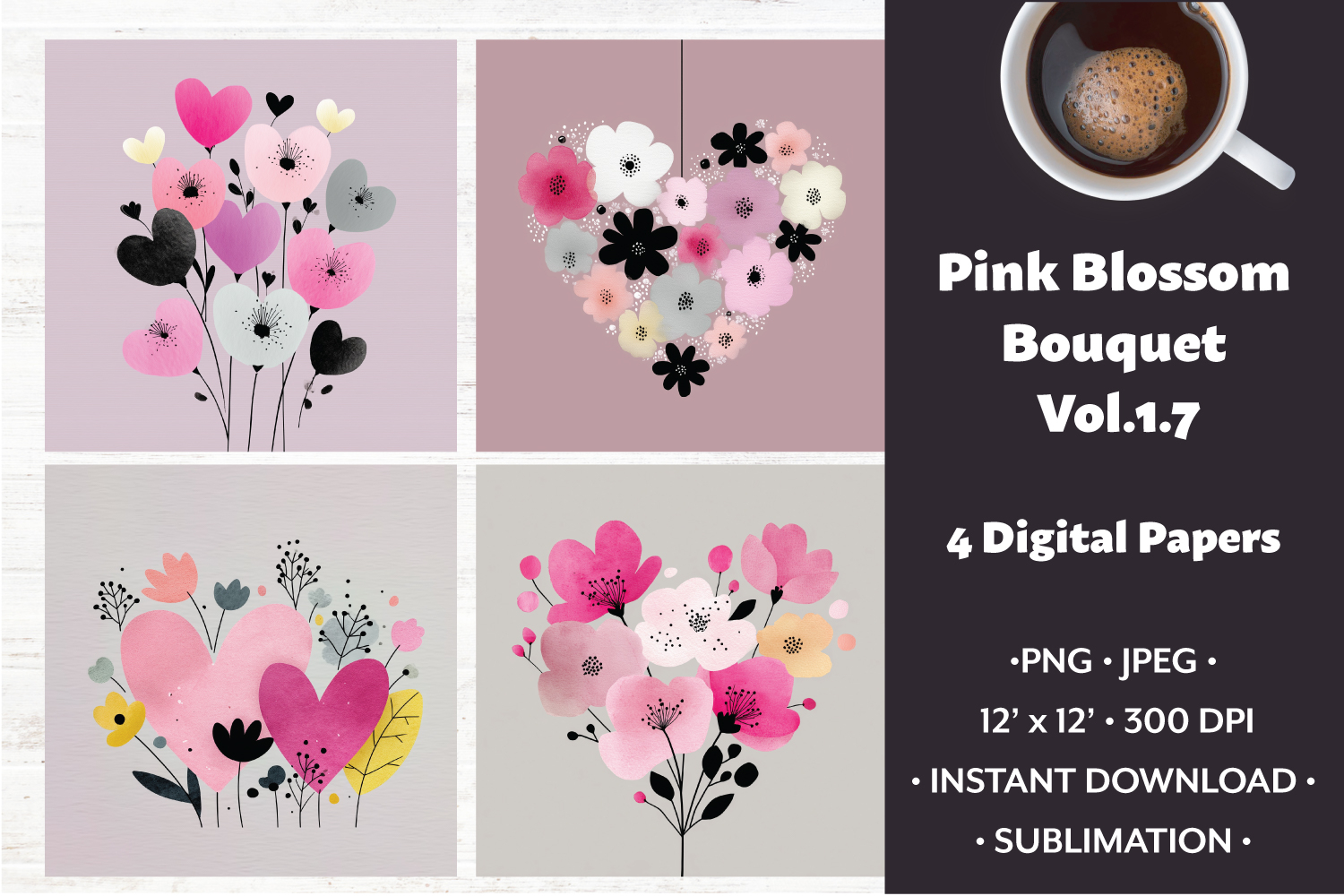 Pink Blossom Bouquet Digital Paper Vol. 1.7, 4 PNG & JPEG