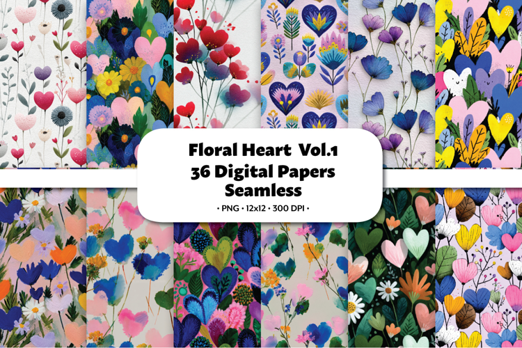 Floral Heart Vol.1 Seamless Digital Paper, 36 PNG