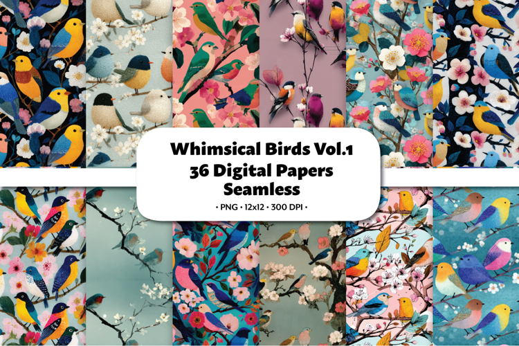 Whimsical Birds Vol.1 Seamless Digital Paper, 36 PNG