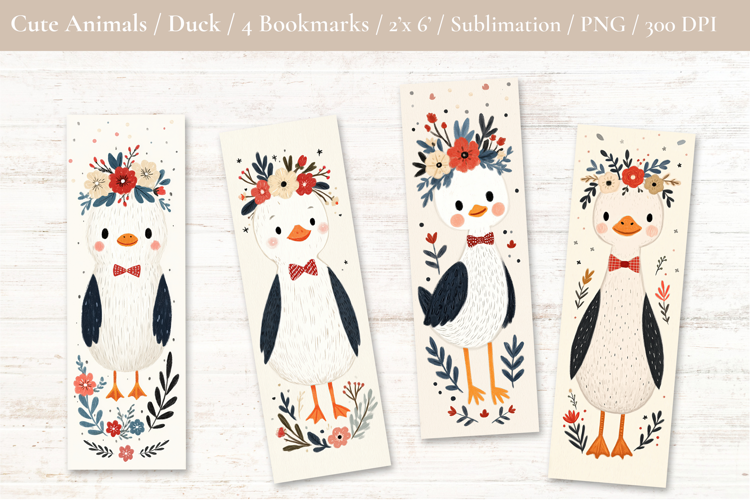 This printable bookmarks feature adorable woodland-style duck illustrated in a soft watercolor look with gentle textures and charming floral crown details. Each character has a sweet, cozy expression and a playful, storybook-inspired style that is perfect for children and animal lovers. The illustrations are designed in a consistent style, making the set ideal for creating coordinated bookmark collections for kids, classrooms, gifts, and reading rewards. The soft neutral tones with subtle pops of color work well for both modern and rustic themes.