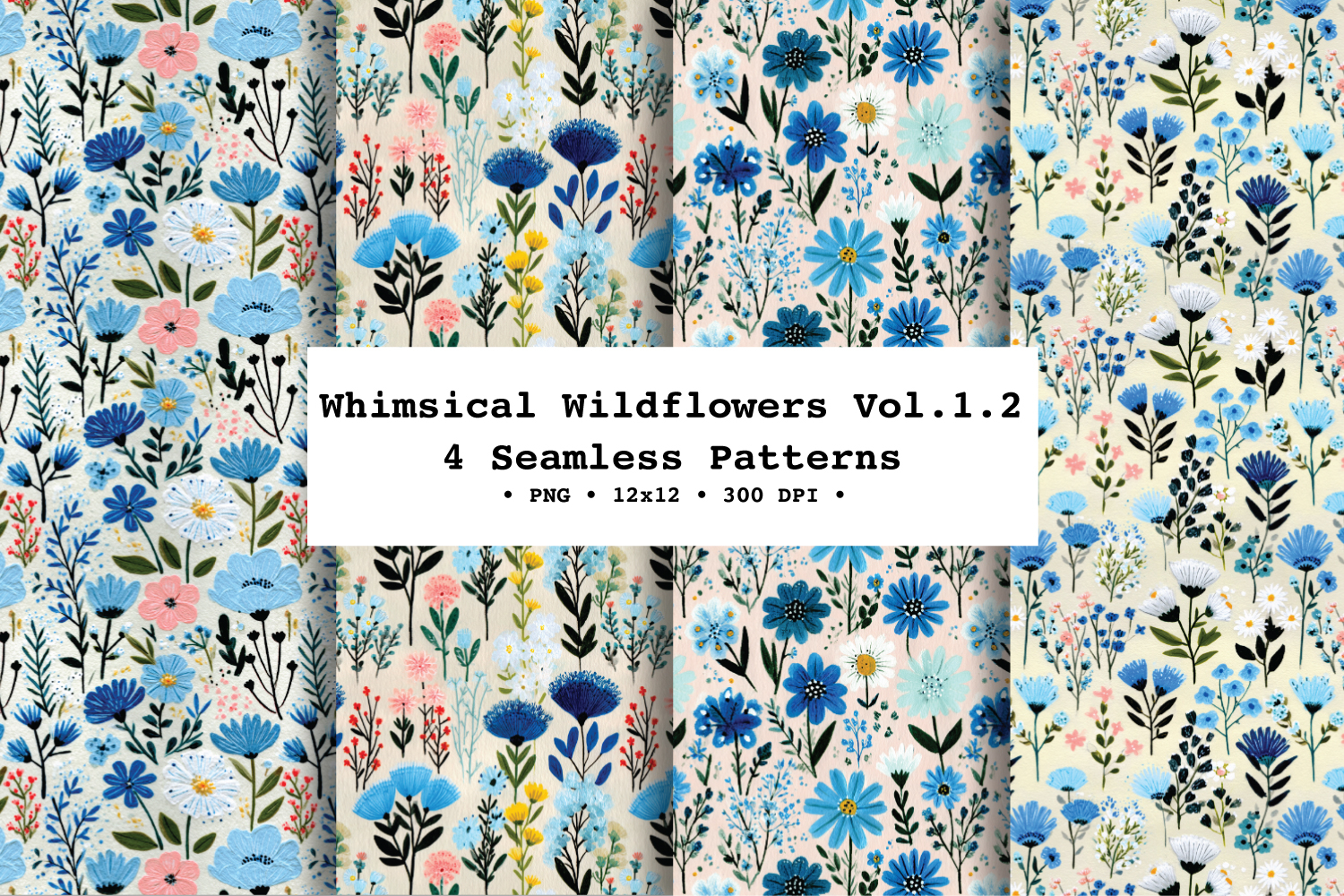 Bring a fresh, breezy meadow vibe to your projects with Whimsical Wildflowers — a coordinating 4 seamless floral patterns filled with delicate wild blooms and leafy stems in a calming blue, cream, soft pink, and green palette on a lightly textured background.