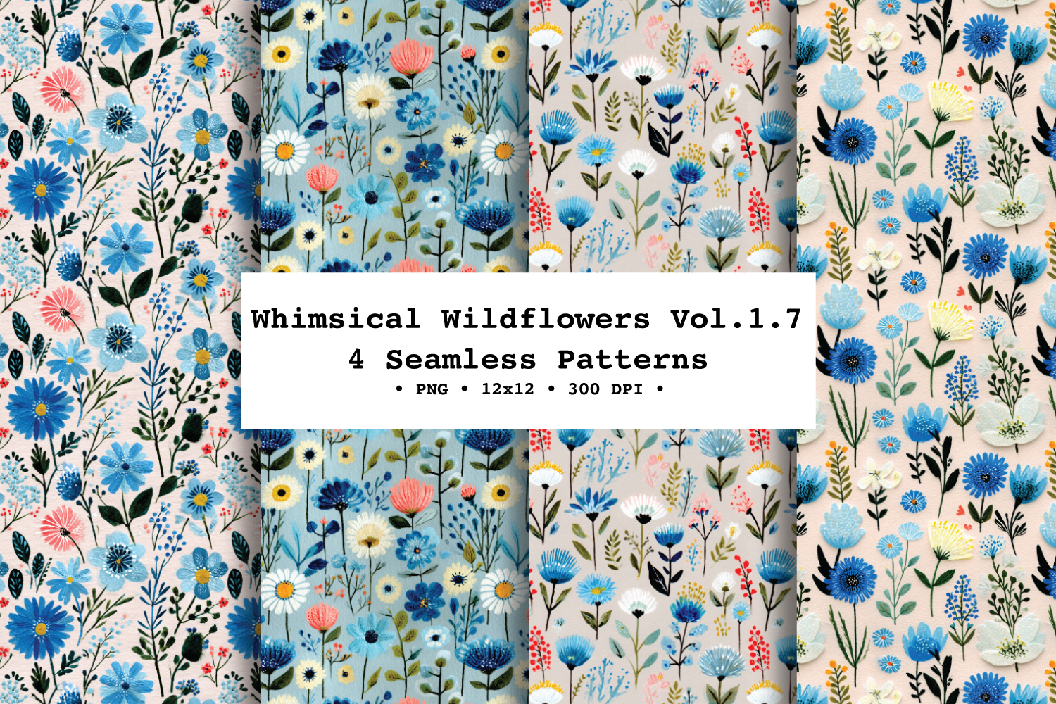 Bring a fresh, breezy meadow vibe to your projects with Whimsical Wildflowers — a coordinating 4 seamless floral patterns filled with delicate wild blooms and leafy stems in a calming blue, cream, soft pink, and green palette on a lightly textured background.