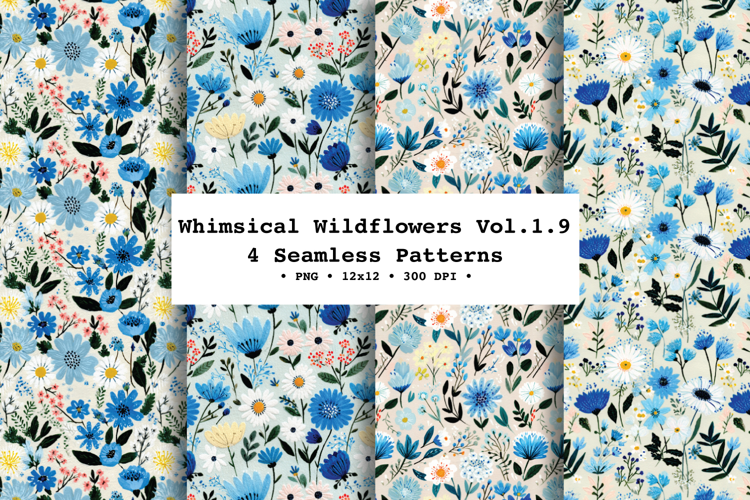 Bring a fresh, breezy meadow vibe to your projects with Whimsical Wildflowers — a coordinating 4 seamless floral patterns filled with delicate wild blooms and leafy stems in a calming blue, cream, soft pink, and green palette on a lightly textured background.
