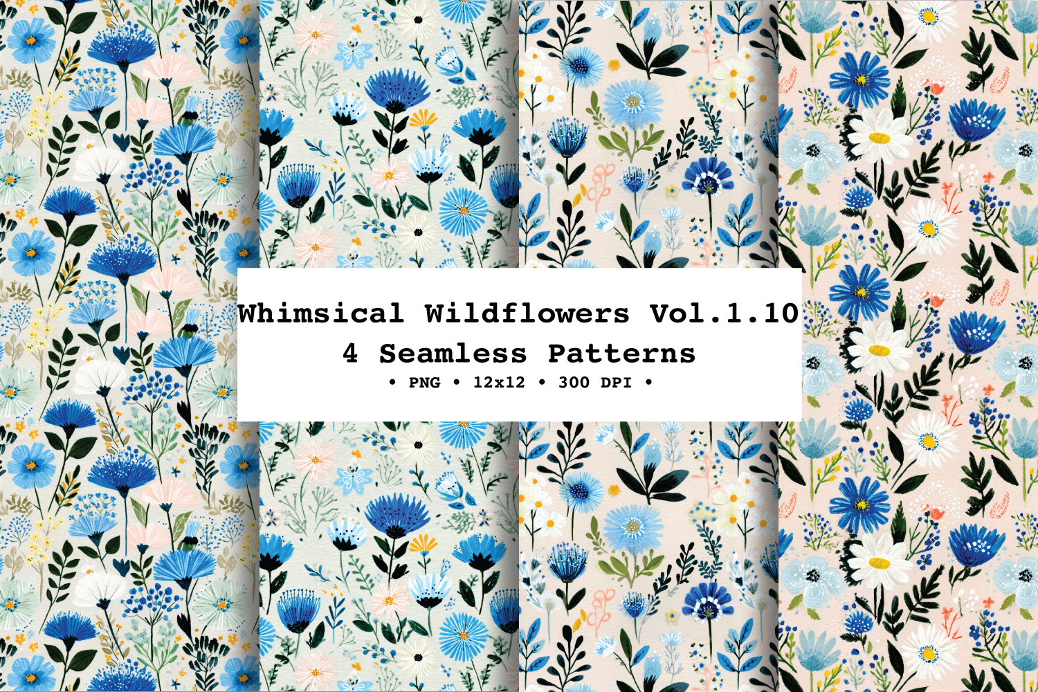 Bring a fresh, breezy meadow vibe to your projects with Whimsical Wildflowers — a coordinating 4 seamless floral patterns filled with delicate wild blooms and leafy stems in a calming blue, cream, soft pink, and green palette on a lightly textured background.