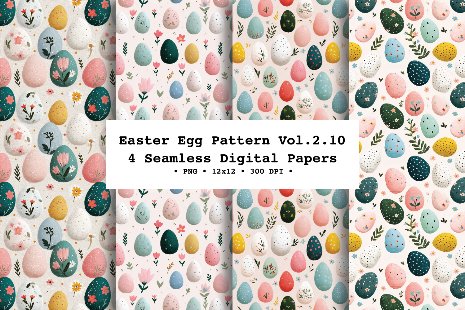 Celebrate spring crafting with Easter Egg Pattern Vol. 2 - 4 seamless digital papers featuring pastel eggs with painted details, tiny florals, sprigs of greenery, and speckled textures. This collection mixes airy spacing with fuller tossed layouts, in a modern gouache/watercolor style and a soft spring palette (blush pink, sage, teal, cream, and warm yellow). These seamless repeats are perfect for creating endless backgrounds for print and digital projects—cute enough for kids’ crafts, but polished enough for elegant stationery.