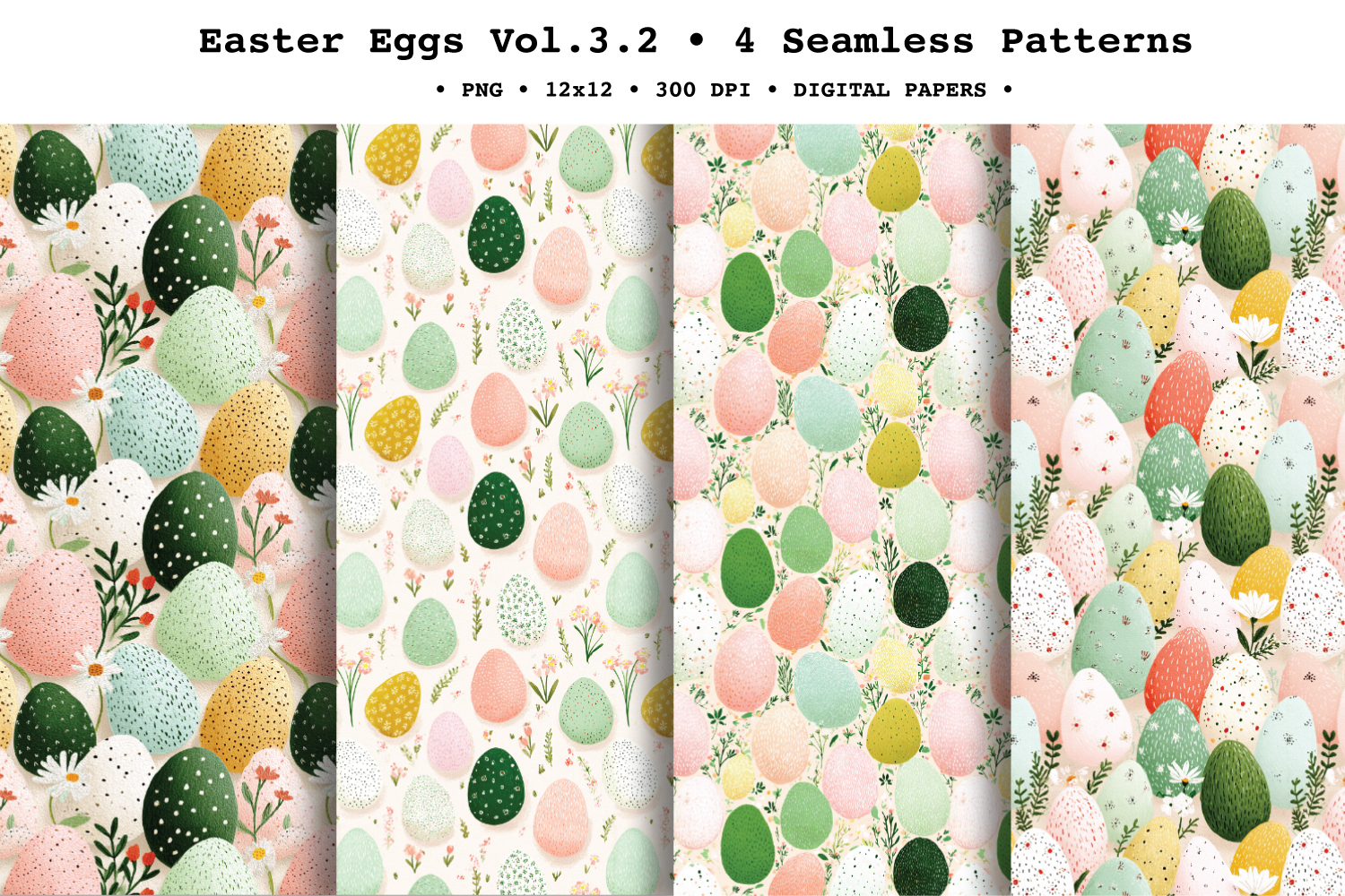 Welcome spring crafting with Easter Egg Pattern charming set of seamless digital patterns featuring hand-painted eggs in a soft pastel palette (sage, mint, blush, butter yellow, and creamy neutrals). Each pattern includes sweet speckled textures and tiny floral accents, with a mix of airy scattered layouts and fuller “tossed” compositions for lots of variety while staying perfectly coordinated.