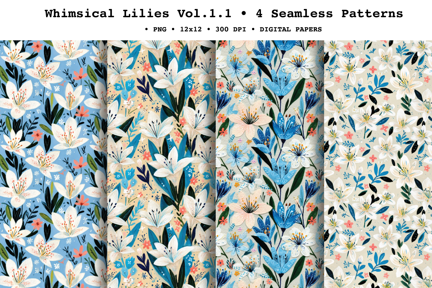 Add elegant spring florals to your designs with Whimsical Lilies ,coordinating seamless patterns featuring painterly lilies, leafy sprigs, and tiny scattered blossoms. The palette blends crisp whites with rich blues, soft coral accents, and fresh greens, finished with a lightly textured, gouache-style look for a modern-yet-timeless floral feel. These seamless repeat digital papers are perfect for creating endless backgrounds for print and digital crafts—ideal for spring stationery, wedding-inspired makes, and nature-themed surface pattern projects.