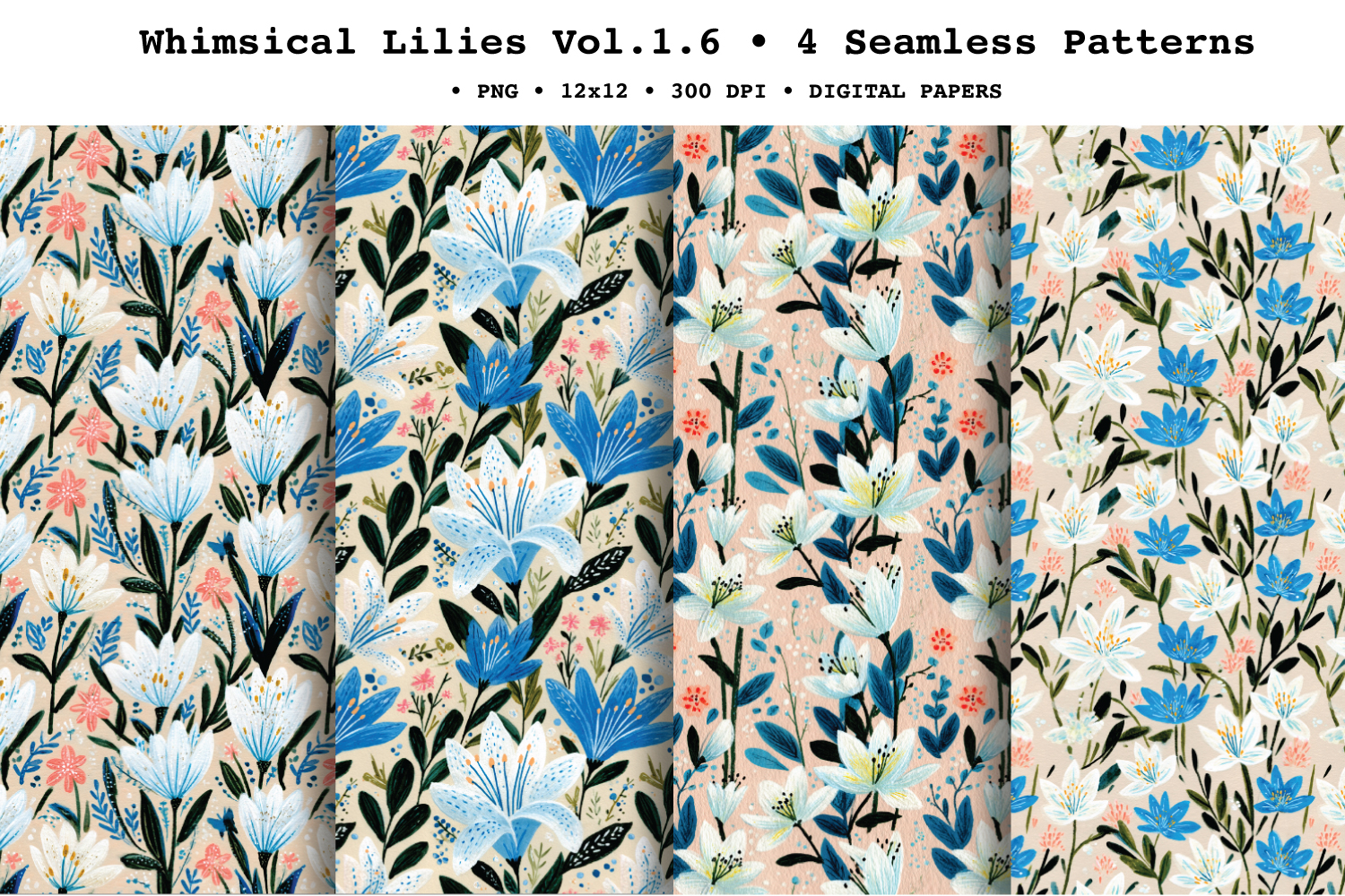 Add elegant spring florals to your designs with Whimsical Lilies ,coordinating seamless patterns featuring painterly lilies, leafy sprigs, and tiny scattered blossoms. The palette blends crisp whites with rich blues, soft coral accents, and fresh greens, finished with a lightly textured, gouache-style look for a modern-yet-timeless floral feel. These seamless repeat digital papers are perfect for creating endless backgrounds for print and digital crafts—ideal for spring stationery, wedding-inspired makes, and nature-themed surface pattern projects.