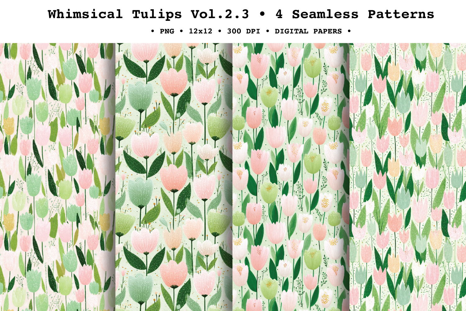 Fresh, soft, and perfectly spring-ready — Whimsical Tulips , coordinating seamless floral patterns featuring charming tulip blooms and leafy sprigs in a gentle palette of sage and emerald greens, blush pink, peach, and creamy white. The painterly gouache texture and airy spacing give these repeats a modern folk feel that’s ideal for elegant spring stationery and everyday floral projects.