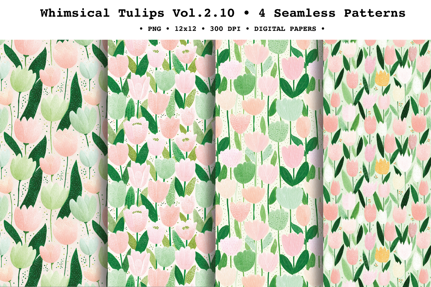 Fresh, soft, and perfectly spring-ready — Whimsical Tulips , coordinating seamless floral patterns featuring charming tulip blooms and leafy sprigs in a gentle palette of sage and emerald greens, blush pink, peach, and creamy white. The painterly gouache texture and airy spacing give these repeats a modern folk feel that’s ideal for elegant spring stationery and everyday floral projects.