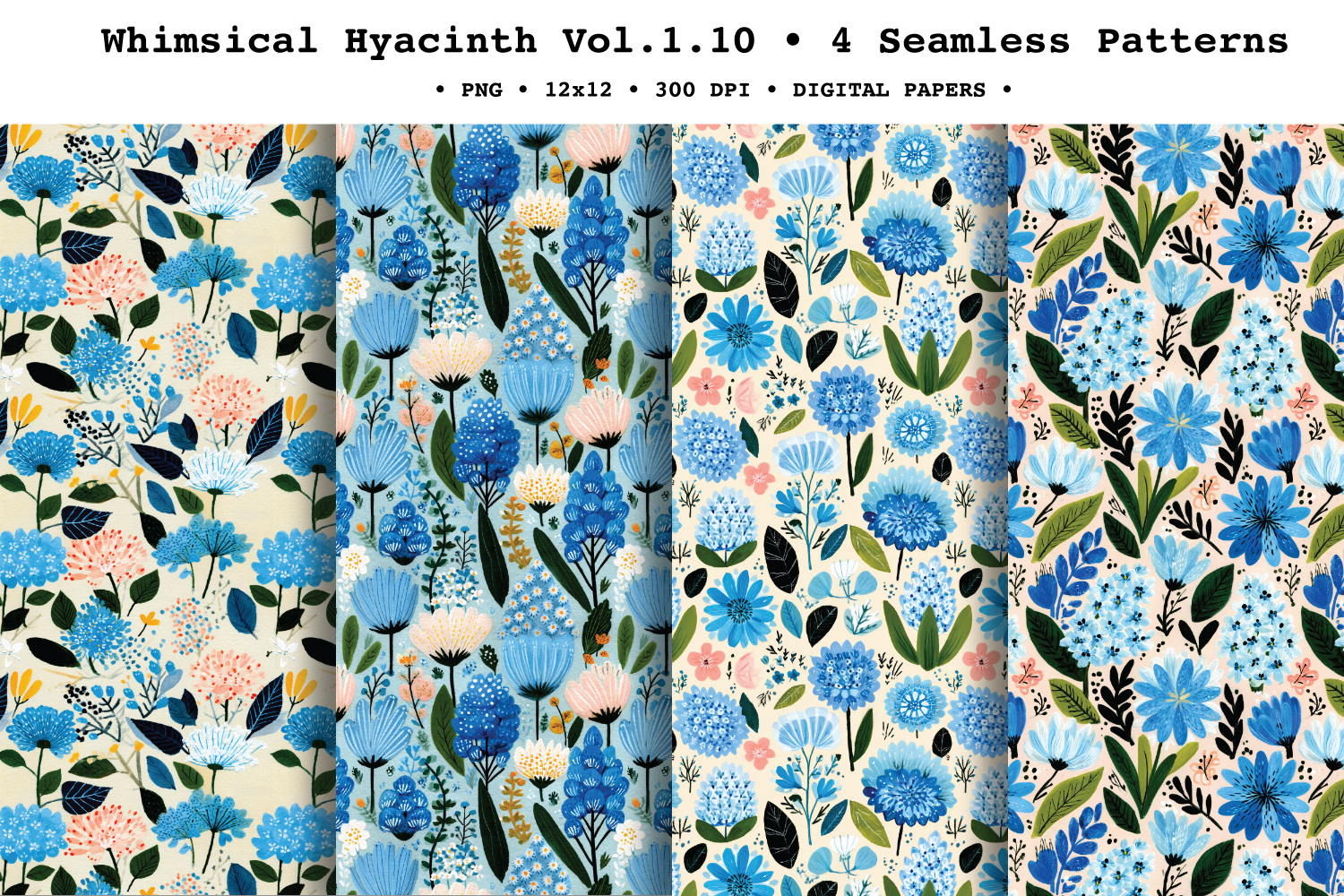 Bring crisp spring florals to your projects with Whimsical Hyacinth coordinated seamless patterns featuring painterly hyacinth blooms, leafy stems, and tiny accent flowers in a fresh palette of cornflower blue, deep navy, soft peach, creamy white, and spring green. The painted gouache texture and airy layouts make these repeats perfect for elegant seasonal stationery and modern botanical designs.