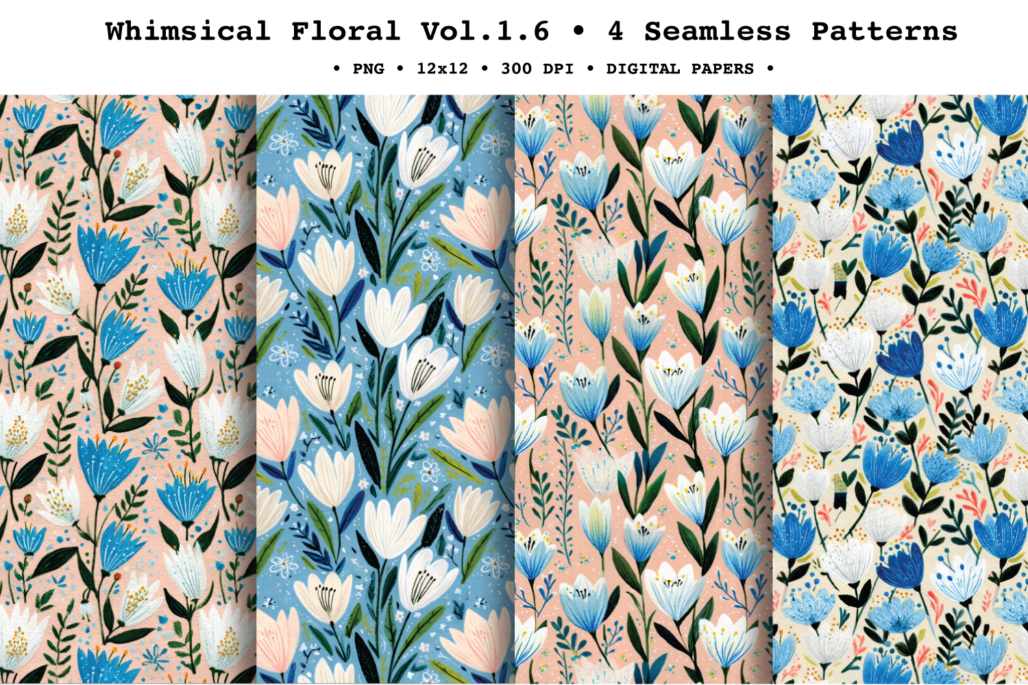 Brighten your projects with Whimsical Floral , a coordinated seamless patterns featuring painterly spring blooms, lily-like florals, bell flowers, leafy stems, and tiny scattered accents. The palette mixes soft sky blues and teal with creamy neutrals, blush pink, and fresh greens, finished with a charming gouache-style texture for a modern folk botanical look. These seamless repeat digital papers are perfect for creating endless backgrounds for both print and digital crafts—ideal for stationery, scrapbooking, and surface pattern projects year-round.