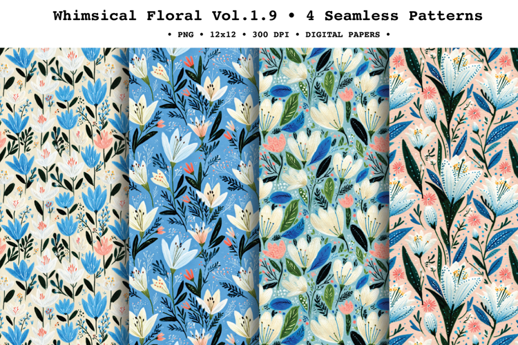 Brighten your projects with Whimsical Floral , a coordinated seamless patterns featuring painterly spring blooms, lily-like florals, bell flowers, leafy stems, and tiny scattered accents. The palette mixes soft sky blues and teal with creamy neutrals, blush pink, and fresh greens, finished with a charming gouache-style texture for a modern folk botanical look. These seamless repeat digital papers are perfect for creating endless backgrounds for both print and digital crafts—ideal for stationery, scrapbooking, and surface pattern projects year-round.