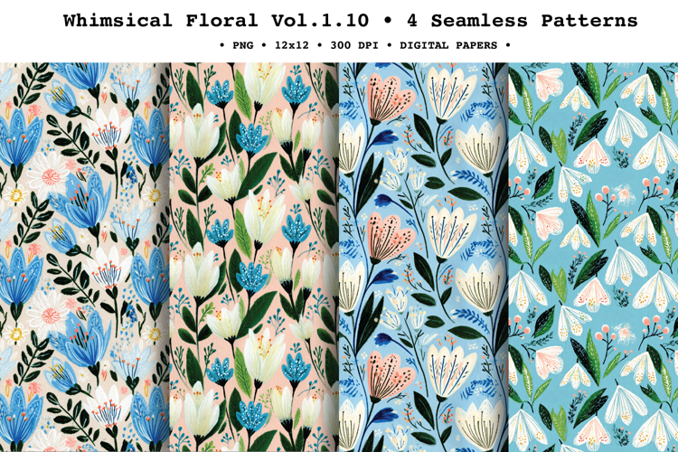 Brighten your projects with Whimsical Floral , a coordinated seamless patterns featuring painterly spring blooms, lily-like florals, bell flowers, leafy stems, and tiny scattered accents. The palette mixes soft sky blues and teal with creamy neutrals, blush pink, and fresh greens, finished with a charming gouache-style texture for a modern folk botanical look. These seamless repeat digital papers are perfect for creating endless backgrounds for both print and digital crafts—ideal for stationery, scrapbooking, and surface pattern projects year-round.