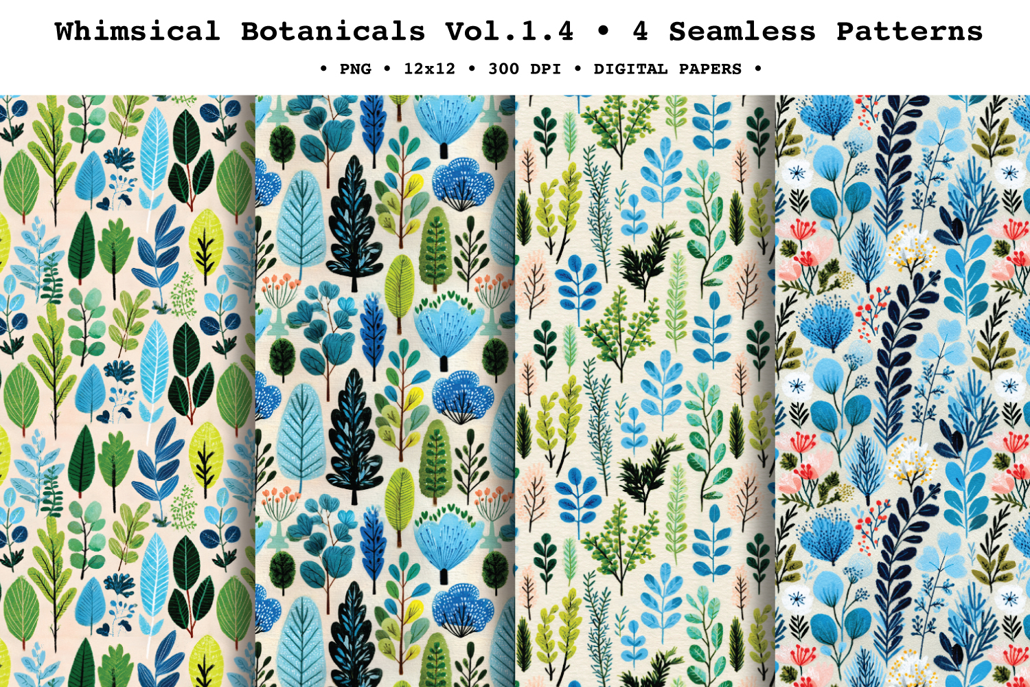 Create fresh, modern nature-inspired projects with Whimsical Botanicals ,a coordinated seamless patterns featuring painted leaves, ferns, sprigs, and botanical shapes in a calming palette of blues, teals, leafy greens, and soft peach accents. The playful folk-art forms and textured gouache look make these repeats perfect for stylish backgrounds that feel both cozy and contemporary.