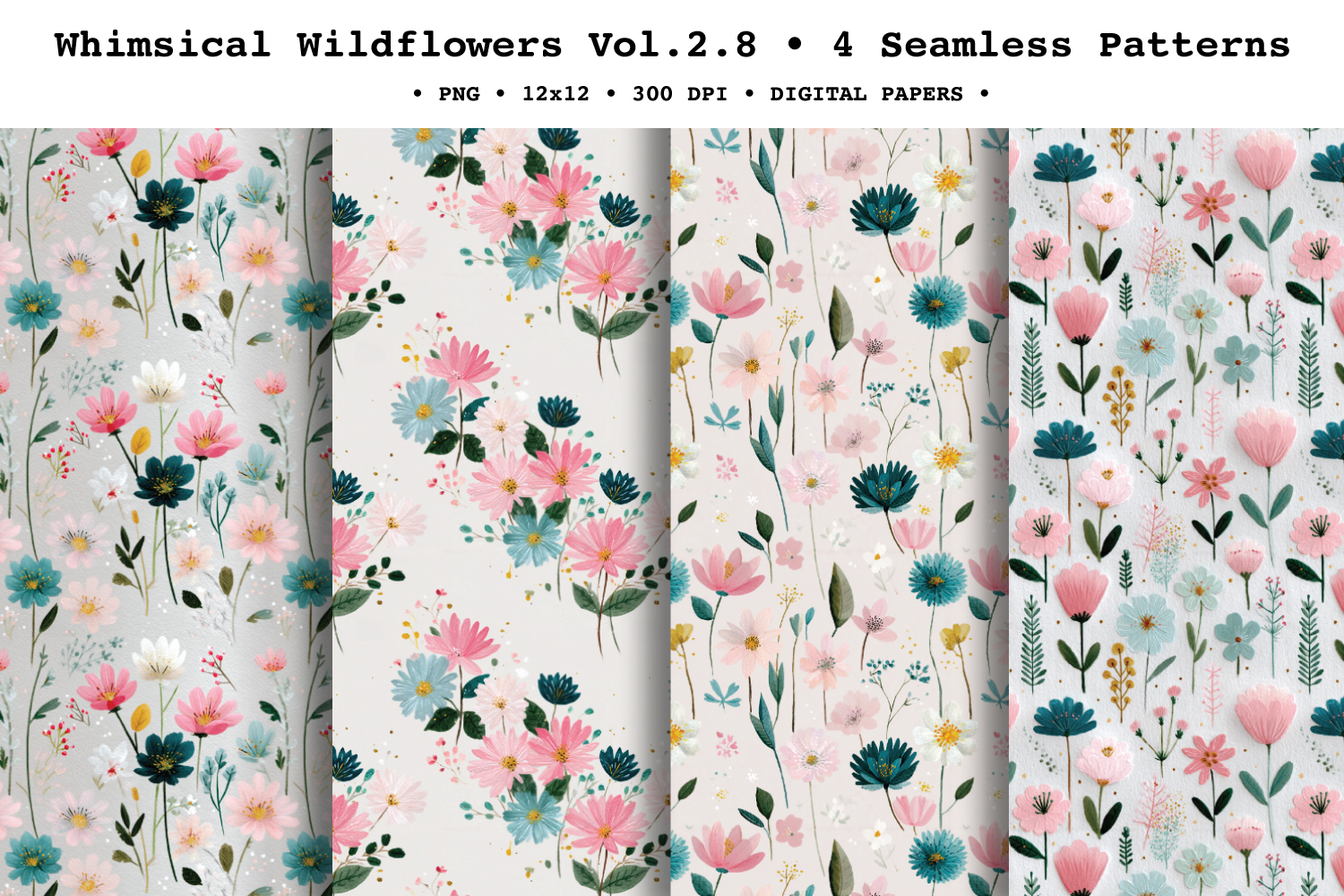 Add a soft, airy meadow feel to your projects with Whimsical Wildflowers ,coordinatedseamless patterns filled with delicate wild blooms, daisy-like florals, and leafy sprigs in a gentle palette of blush pink, cream, soft teal, and fresh green. The painted watercolor/gouache texture and light, scattered layouts make these repeats perfect for elegant spring stationery and nature-inspired designs. These seamless repeat digital papers are ideal for creating endless backgrounds for both print and digital crafting.