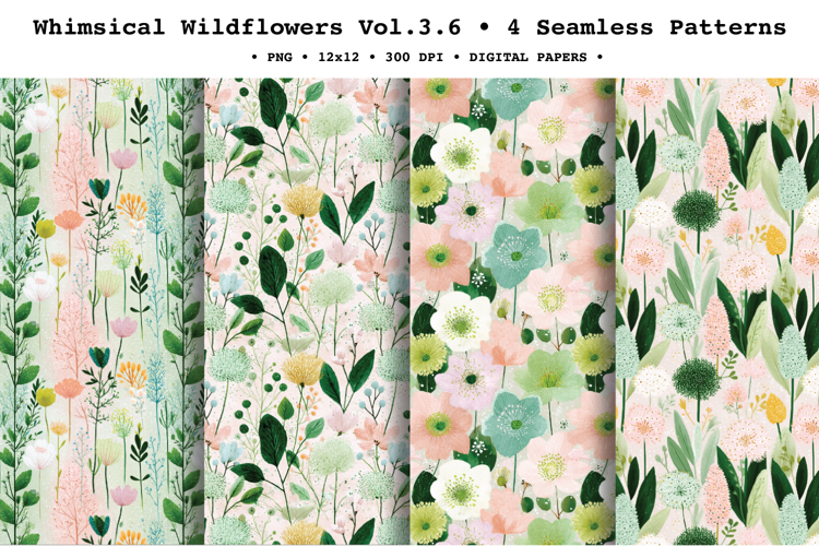 Bring soft spring meadow magic to your designs with Whimsical Wildflowers Vol. 3, coordinated seamless patterns featuring airy wild blooms, delicate stems, and fluffy dandelion-like florals in a dreamy palette of sage green, blush pink, peach, butter yellow, and creamy white. The painterly watercolor/gouache texture and light, soothing backgrounds make these repeats perfect for gentle, elegant projects with a fresh seasonal feel.