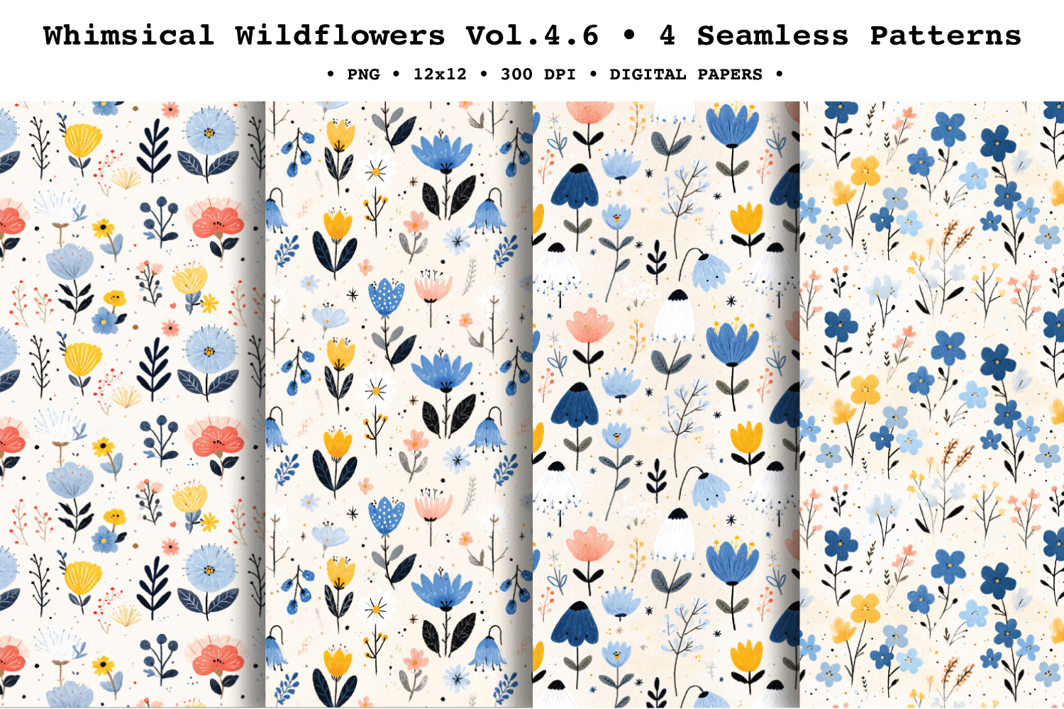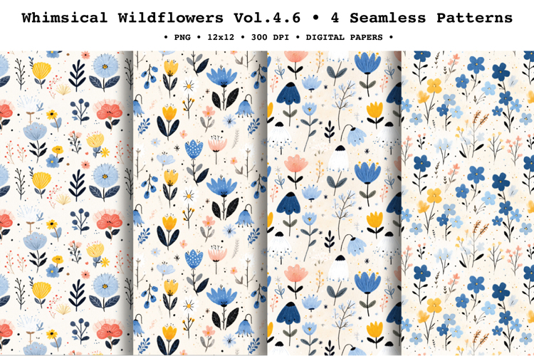 Add a bright, cheerful spring feel to your projects with Whimsical Wildflowers Vol. 4, coordinatedseamless patterns featuring simple folk-style wild blooms, tiny scattered florals, and delicate stems in a fresh palette of cornflower blue, soft blush, butter yellow, and inky black accents on a clean light background. The airy spacing and hand-painted watercolor/gouache texture make these repeats perfect for modern, minimal floral designs.