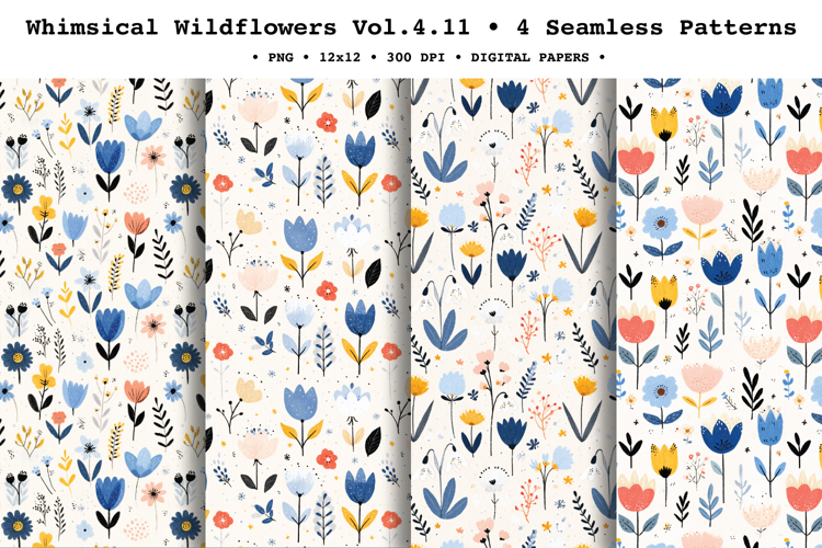 Add a bright, cheerful spring feel to your projects with Whimsical Wildflowers Vol. 4, coordinatedseamless patterns featuring simple folk-style wild blooms, tiny scattered florals, and delicate stems in a fresh palette of cornflower blue, soft blush, butter yellow, and inky black accents on a clean light background. The airy spacing and hand-painted watercolor/gouache texture make these repeats perfect for modern, minimal floral designs.