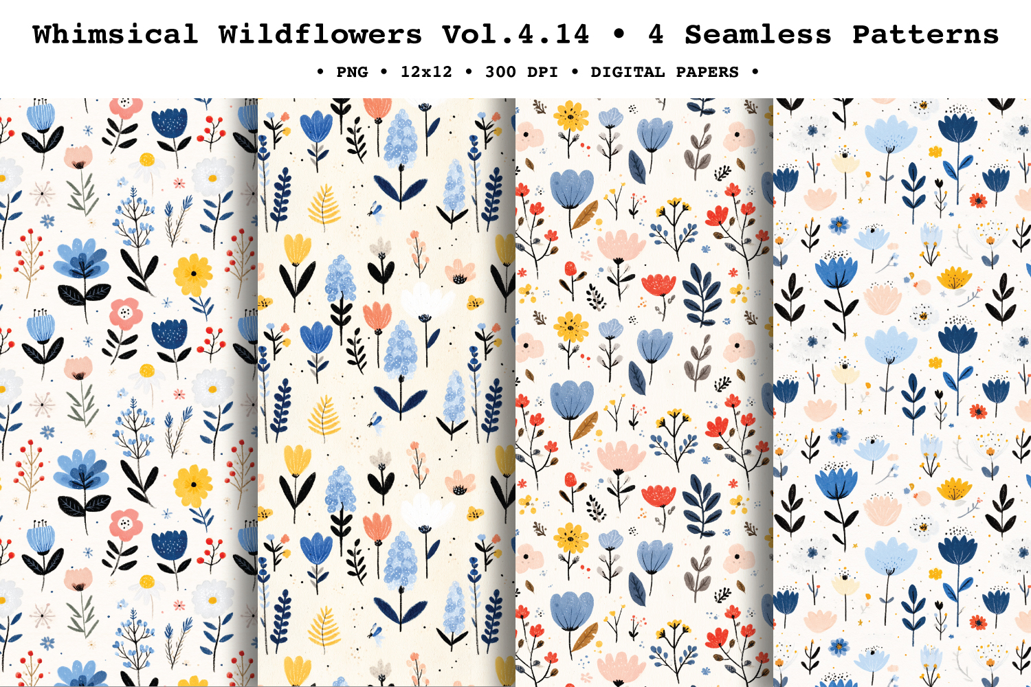 Add a bright, cheerful spring feel to your projects with Whimsical Wildflowers Vol. 4, coordinatedseamless patterns featuring simple folk-style wild blooms, tiny scattered florals, and delicate stems in a fresh palette of cornflower blue, soft blush, butter yellow, and inky black accents on a clean light background. The airy spacing and hand-painted watercolor/gouache texture make these repeats perfect for modern, minimal floral designs.