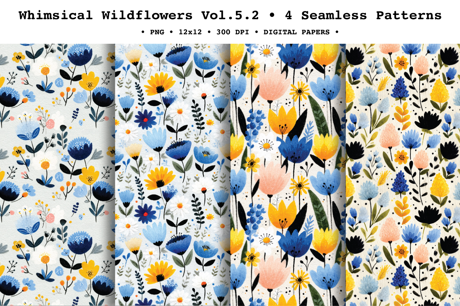 Make your projects pop with Whimsical Wildflowers Vol. 5, vibrant seamless patterns featuring bold folk-style blooms and playful scattered florals in a striking palette of cobalt and navy blues, sunny yellow, soft blush, and crisp white, finished with inky stems and a painted watercolor/gouache texture. This pack includes a mix of fuller tossed layouts and lighter airy repeats, perfect for eye-catching spring and summer designs.