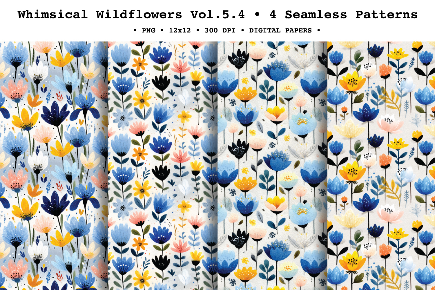 Make your projects pop with Whimsical Wildflowers Vol. 5, vibrant seamless patterns featuring bold folk-style blooms and playful scattered florals in a striking palette of cobalt and navy blues, sunny yellow, soft blush, and crisp white, finished with inky stems and a painted watercolor/gouache texture. This pack includes a mix of fuller tossed layouts and lighter airy repeats, perfect for eye-catching spring and summer designs.