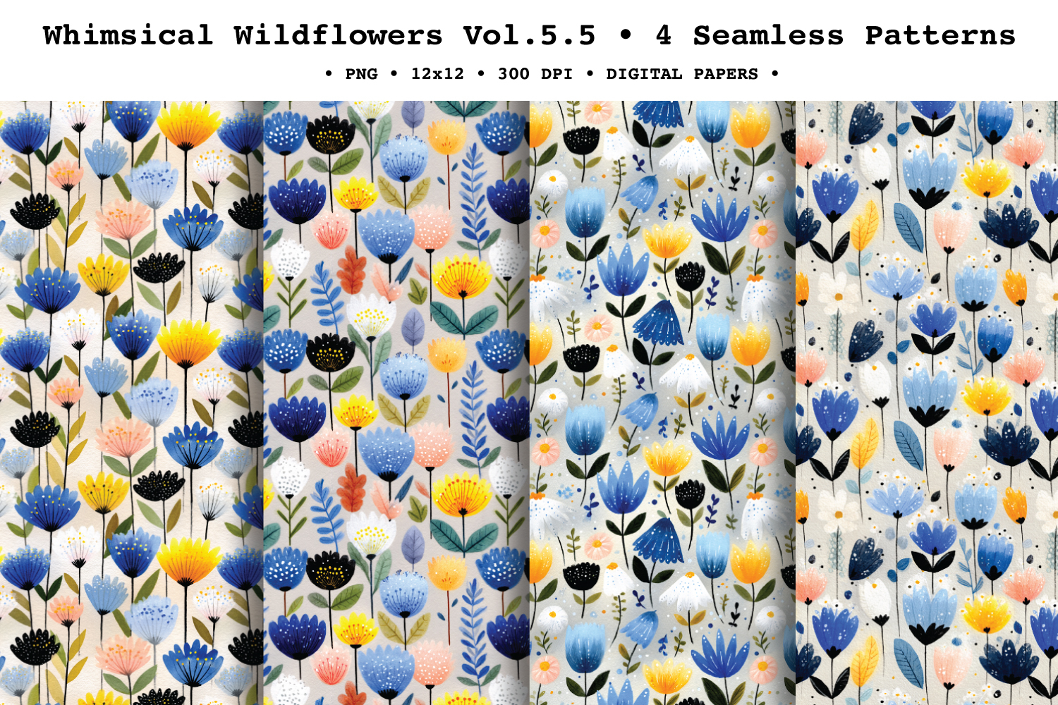 Make your projects pop with Whimsical Wildflowers Vol. 5, vibrant seamless patterns featuring bold folk-style blooms and playful scattered florals in a striking palette of cobalt and navy blues, sunny yellow, soft blush, and crisp white, finished with inky stems and a painted watercolor/gouache texture. This pack includes a mix of fuller tossed layouts and lighter airy repeats, perfect for eye-catching spring and summer designs.