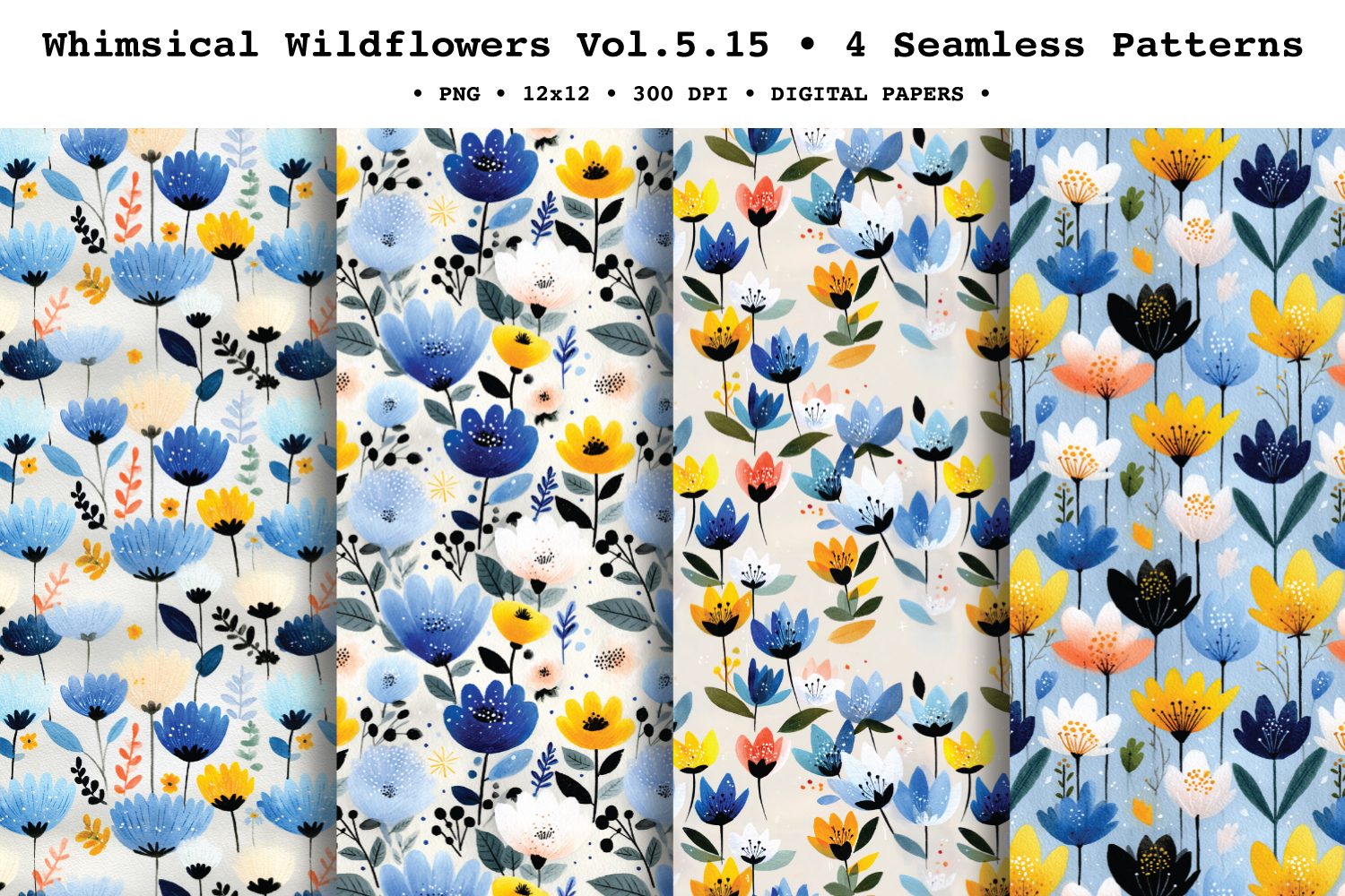 Make your projects pop with Whimsical Wildflowers Vol. 5, vibrant seamless patterns featuring bold folk-style blooms and playful scattered florals in a striking palette of cobalt and navy blues, sunny yellow, soft blush, and crisp white, finished with inky stems and a painted watercolor/gouache texture. This pack includes a mix of fuller tossed layouts and lighter airy repeats, perfect for eye-catching spring and summer designs.