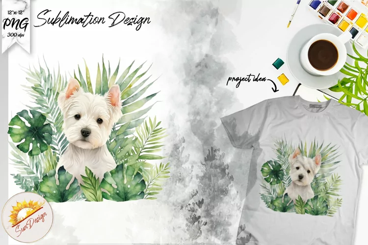 West Highland Terrier Tropical Leaves Watercolor Sublimation example image 1