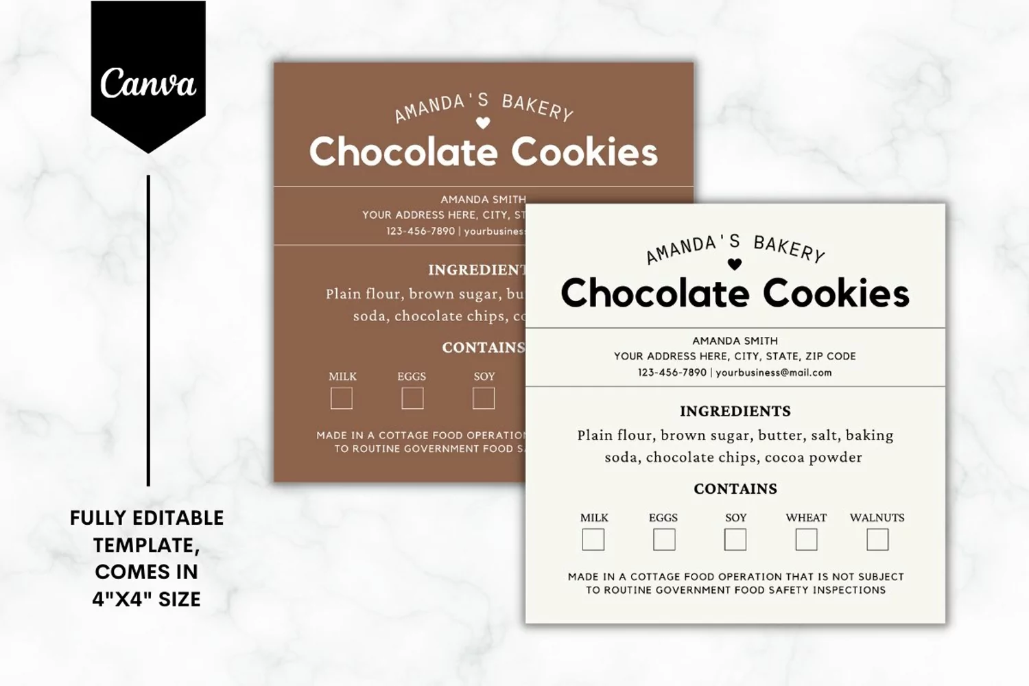 Editable Cottage Law Labels Template Food License Label For Home Bakery Product Editable Cookie Ingredient List With Allergen Lab Custom White Label Cookies Feminine Cookies Ingredients Labels Texas Cottage Law Labels Design Printable Baker Ingredients Sticker Made In A Home Kitchen Template Custom Home Bakery Stickers Cottage Food Law Label Template Canva
