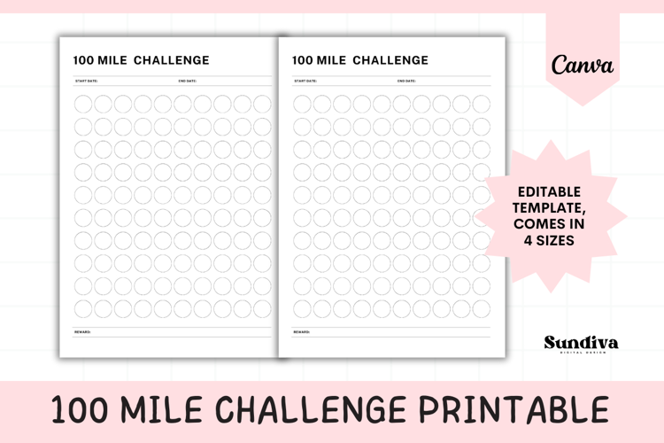 Stay active and reach your goals with our Editable 100 Mile Running or Walking Challenge Canva Template and Printable PDF Files! This motivational tracker includes space to record your start date, end date, reward, and 100 circles to check off each mile completed. It’s a fun and easy way to stay accountable and celebrate your progress. Fully customizable in Canva and available in four sizes (US Letter, Half Letter, A4, A5), you can print it or use it digitally. Perfect for anyone starting their fitness journey or looking for a new challenge!