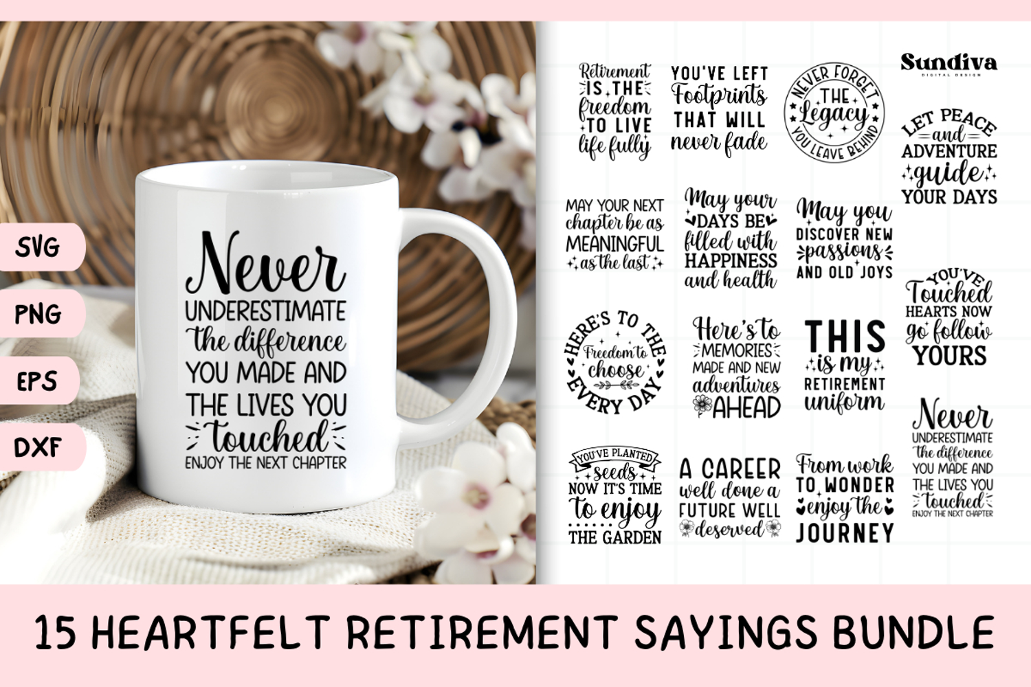 Each design is provided in SVG, PNG, DXF, and EPS formats, making them easy to use with Cricut, Silhouette, and other cutting machines. Ideal for t-shirts, mugs, greeting cards, tote bags, wall art, photo frames, and more - this bundle adds a warm and memorable touch to any retirement celebration.