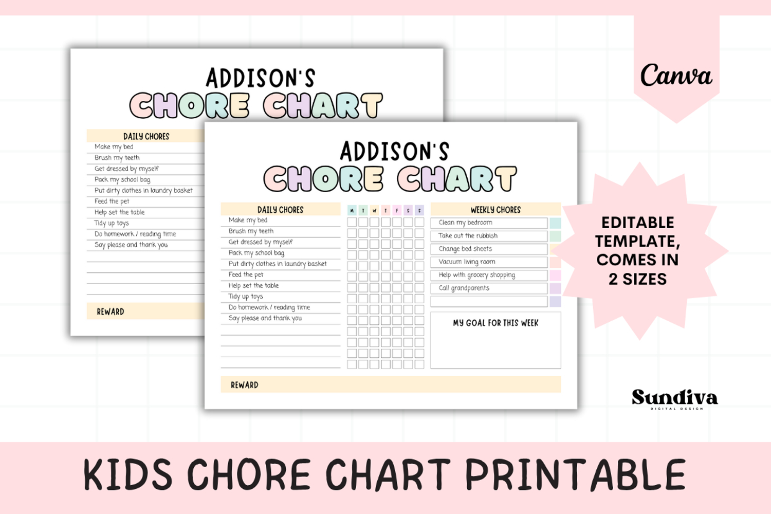 This editable chart is fully customizable in Canva - you can change colors, fonts, and text to fit your child’s style. Perfect for helping kids build responsibility and consistency at home in a fun and colorful way.