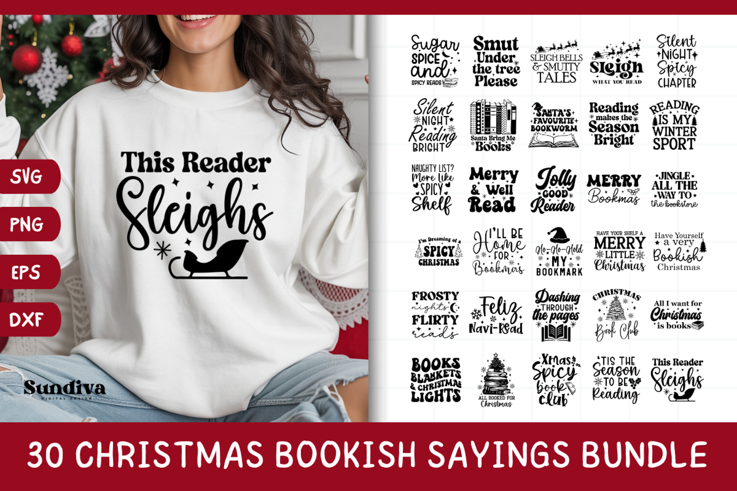 Each design comes in SVG, PNG, DXF, and EPS, making it easy to use with Cricut, Silhouette, and all design software. Create Christmas shirts, mugs, tote bags, bookmarks, stickers, ornaments, and more with these fun bookish holiday phrases.