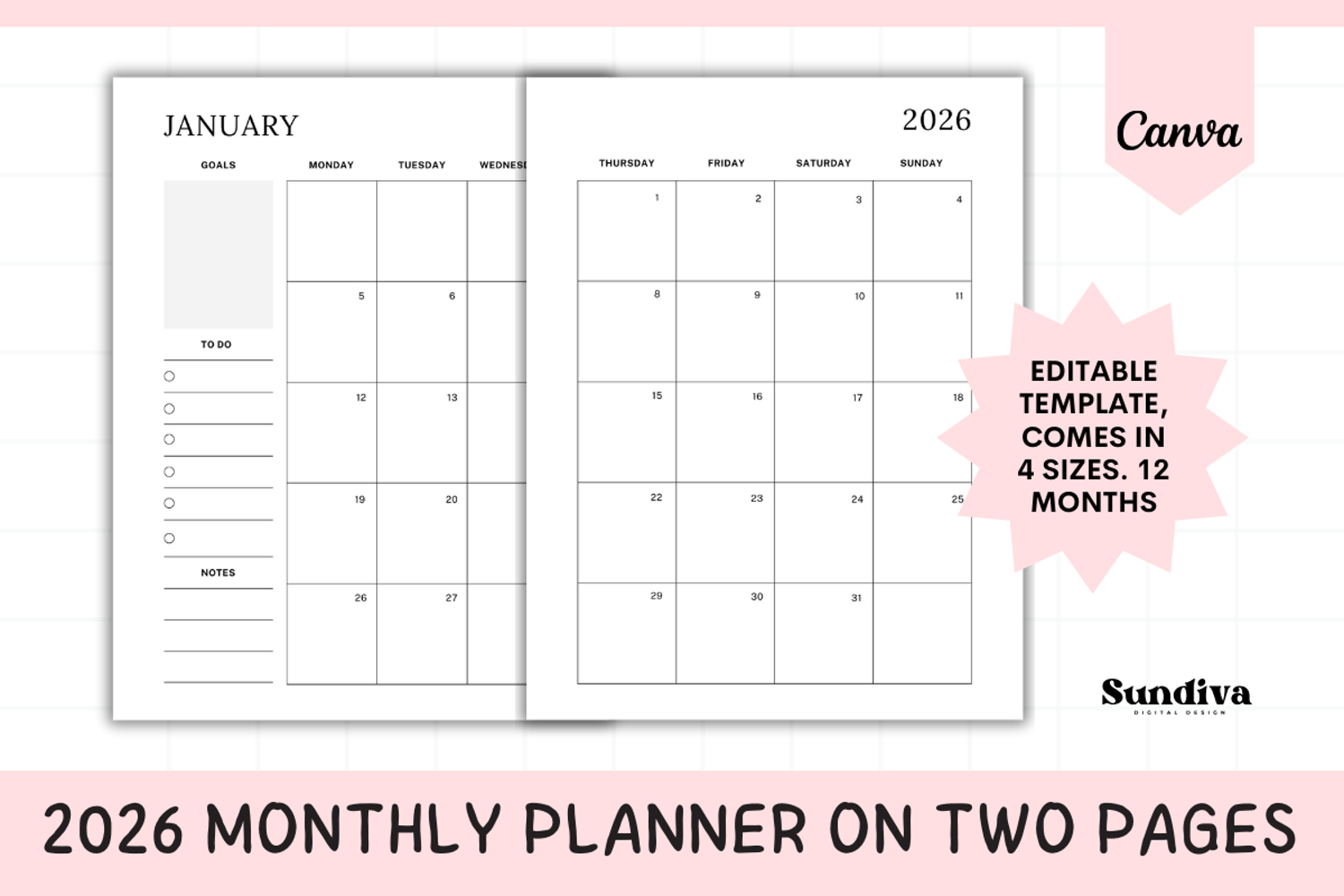 Two Page Monthly Planner Goal Planner Printable Dated Monthly Planner 2026 Planner Insert 2026 Minimal Monthly Planner 2026 Monthly Planner Printable Printable 2026 Planner Pdf Canva Monthly Planner 2026 Monthly Planner With Notes Organization Planner Pdf