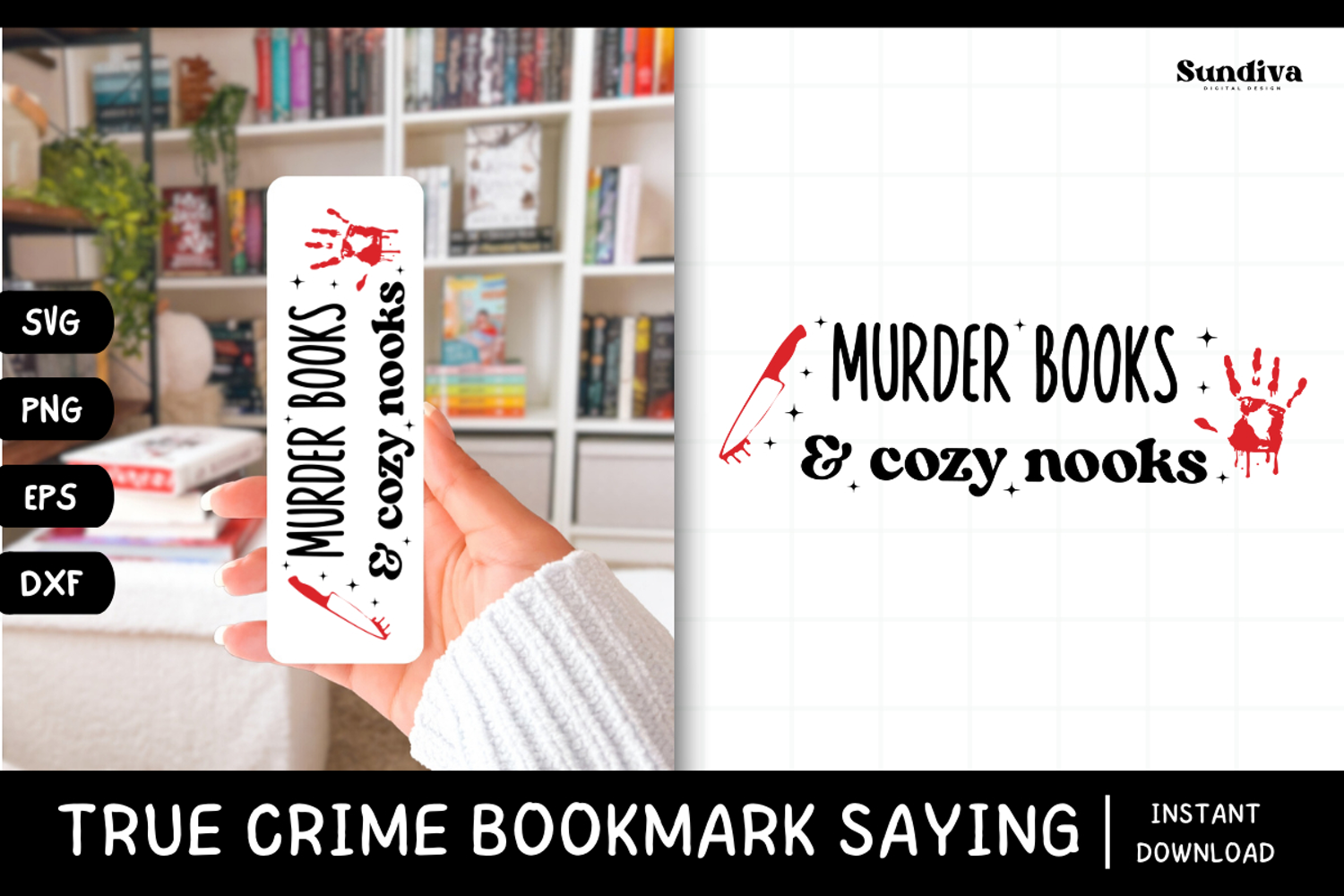 You’ll receive the design in SVG, PNG, DXF, and EPS formats, making it easy to use with Cricut, Silhouette, and most design software. Ideal for creating bookmarks, stickers, book accessories, or fun gifts for true crime lovers.