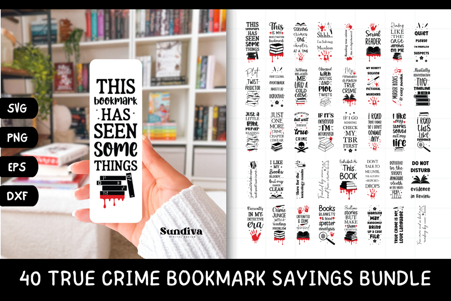 Each design comes in SVG, PNG, DXF, and EPS formats, making them easy to use with Cricut, Silhouette, and other design software. Ideal for creating bookmarks, stickers, book accessories, gifts, or bookish merch for fellow true crime fans.