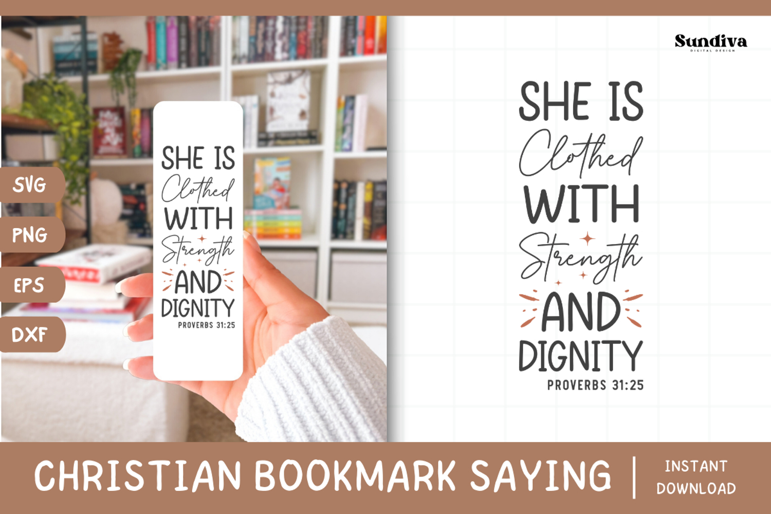 Christian Bookmark Saying SVG | She Is Clothed With Strength example image 1