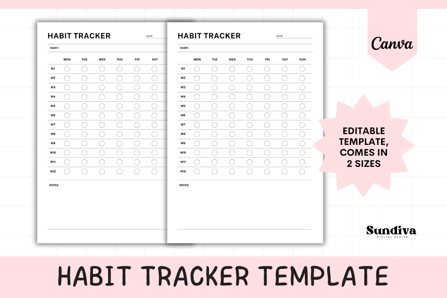 Focus on one habit for an entire quarter with this structured 12-Week Habit Tracker. Organized by week (W1–W12) and day (Monday to Sunday), it gives you a clear overview of your consistency over 3 months. Includes a Notes section at the bottom for reflections or reminders.