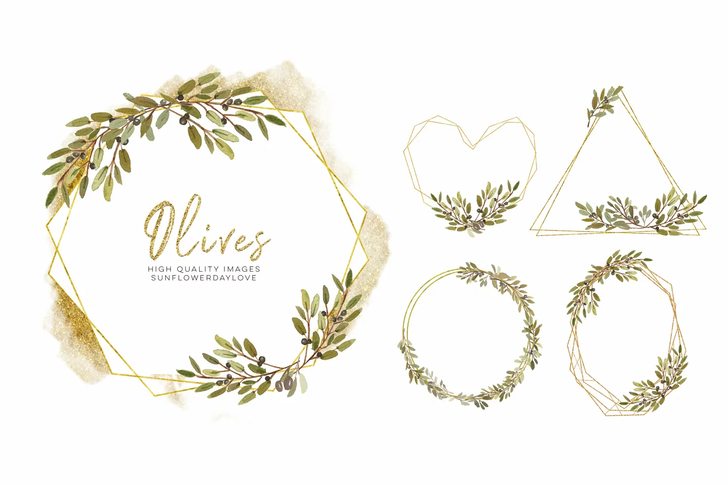 Hand Painted Olive Gold Bohemian Boho Clip Art Illustrations Frame Olive Botanical Leaves Olive Branch Watercolor Frame Leaf Clipart