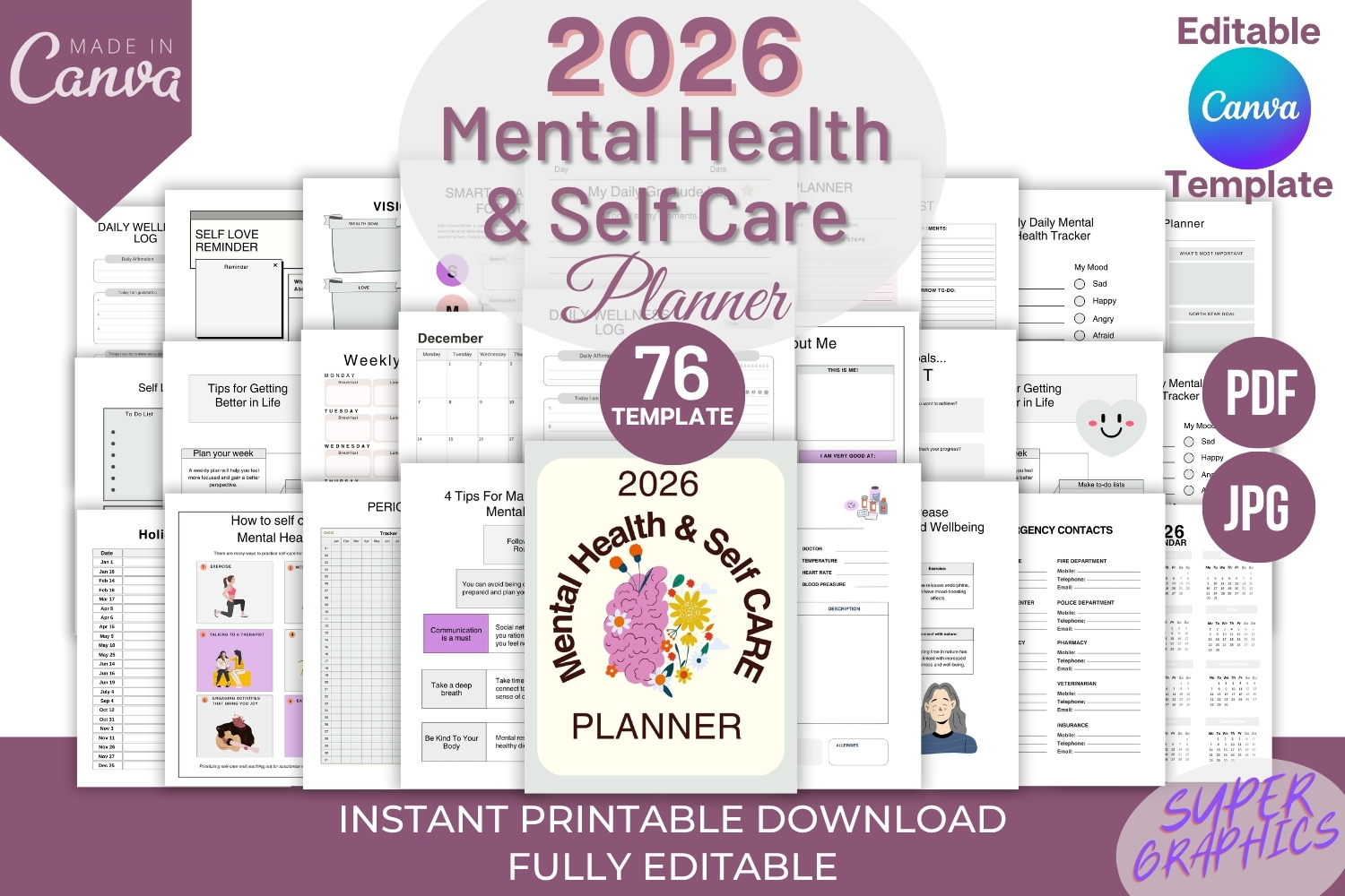 Bring balance, positivity, and purpose into your 2026 with this all-in-one Mental Health & Self-Care Planner Bundle.