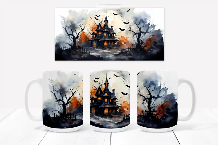 Halloween haunted house mug sublimation design wrap 15 Oz, Halloween mug design, Halloween haunted house sublimation.
