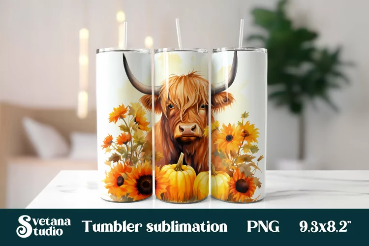 Sunflower pumpkin highland cow tumbler sublimation design wrap 20 Oz, highland cow tumbler wrap design, highland cow sublimation.