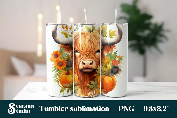 Sunflower pumpkin highland cow tumbler sublimation design wrap 20 Oz, highland cow tumbler wrap design, highland cow sublimation.