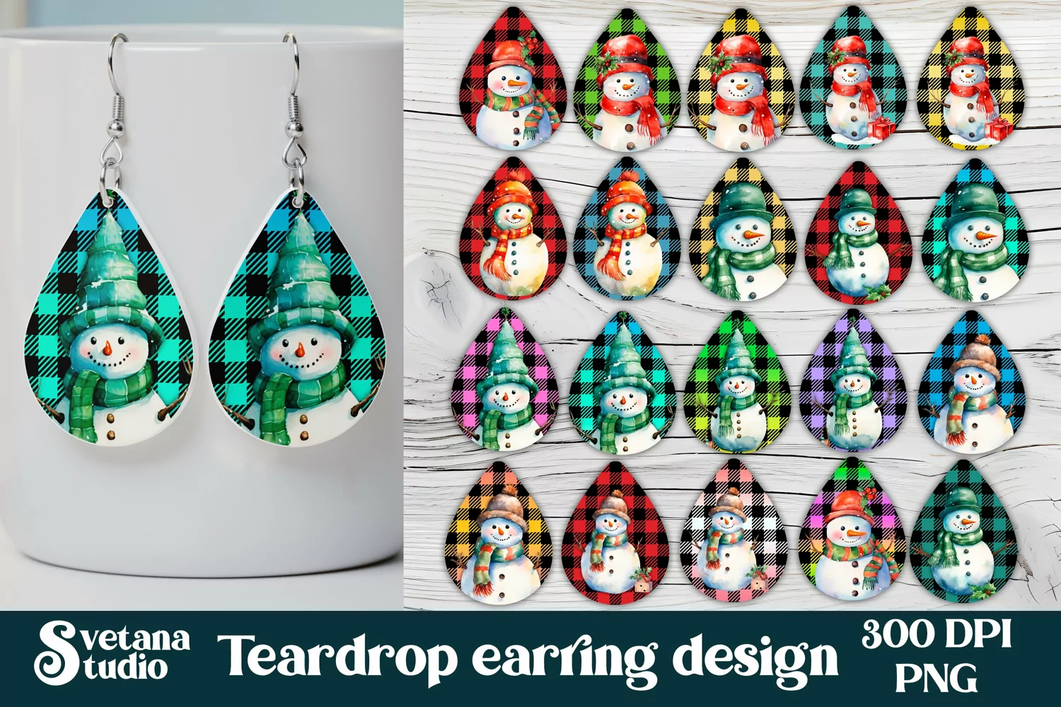 Christmas teardrop earring bundle sublimation design, Christmas snowman buffallo plaid sublimation, snowman earring PNG design, earring template png.