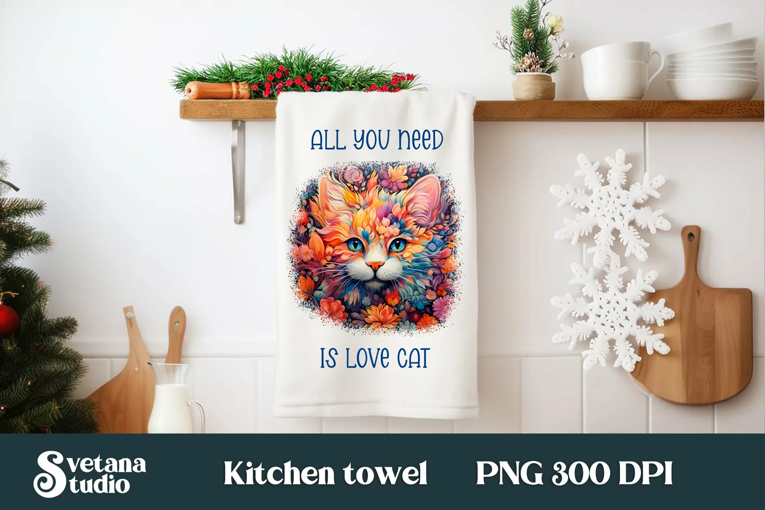 Cute cat kitchen towel sublimation design, cute cat dish towel clipart PNG, animal kitchen towel design.