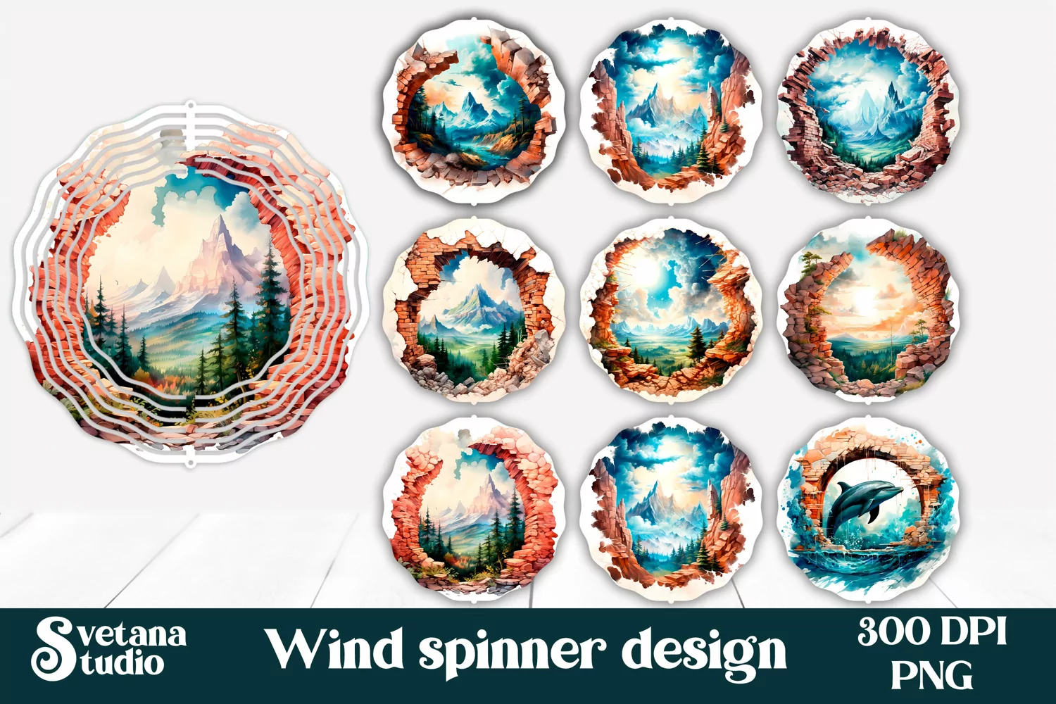 3d hole wind spinner sublimation design, 3d hole forest mountains sublimation design, 3d broken brick wall wind spinner PNG.